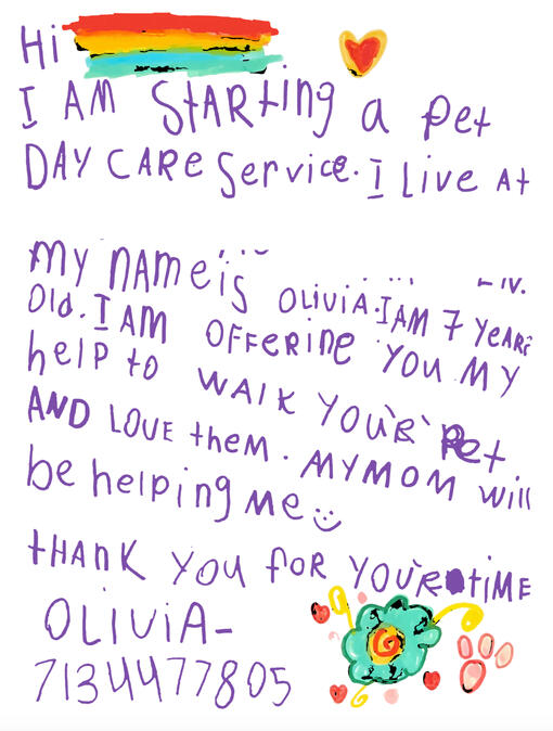 This was the letter a wrote and the logo I made when we were in lockdown... Pardon my mispelling, I was just learning how to write :-)